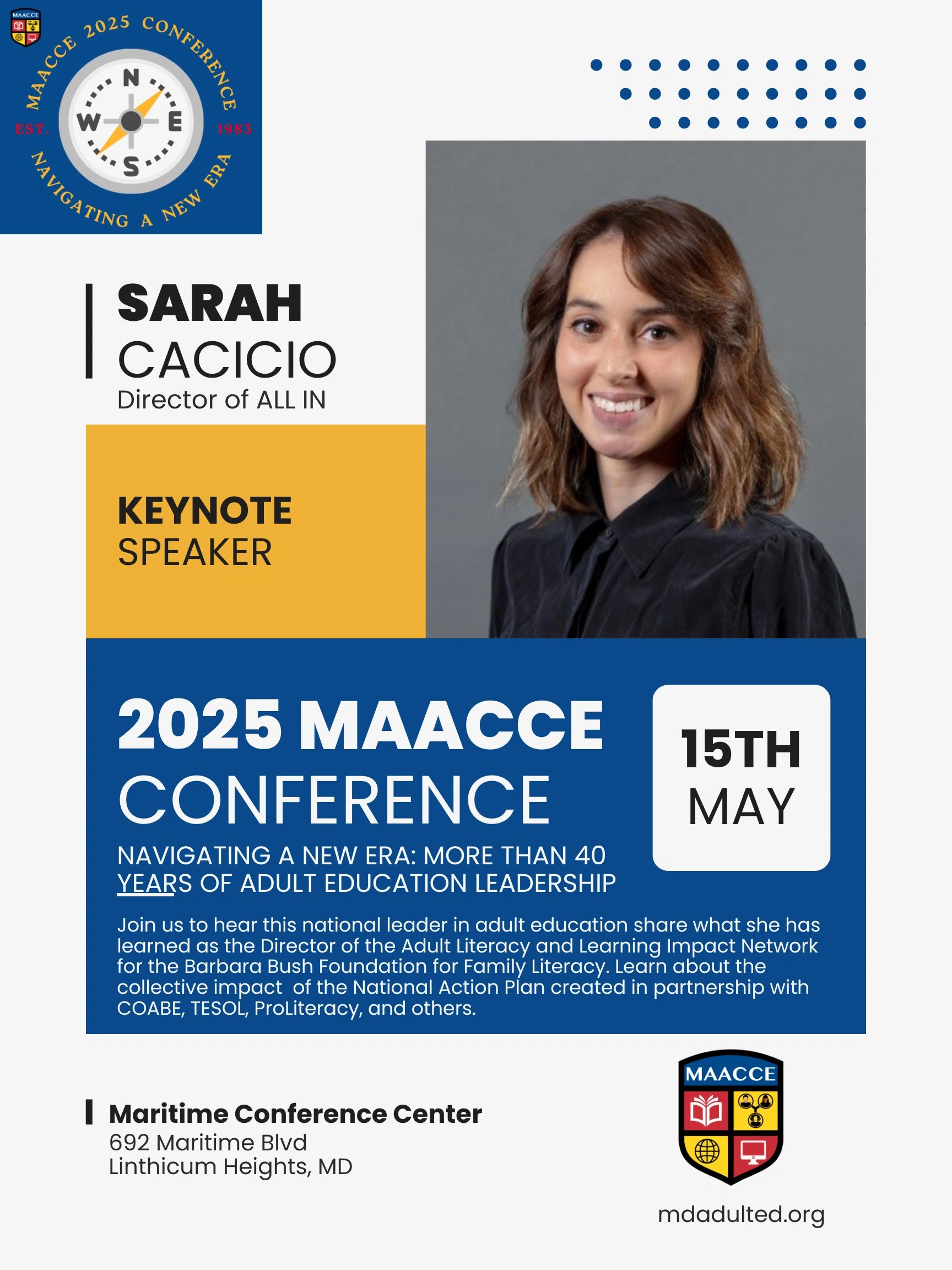 The Maryland Association for Adult, Community and Continuing Education is a non-profit organization providing leadership in Maryland for those interested in advancing education as a lifelong process. MAACCE provides a central forum for a wide variety of adult, community and continuing education groups. MAACCE encourages organizations and agencies in Maryland to cooperate in a broad spectrum of educational programs and activities in support of the lifelong learning concept.